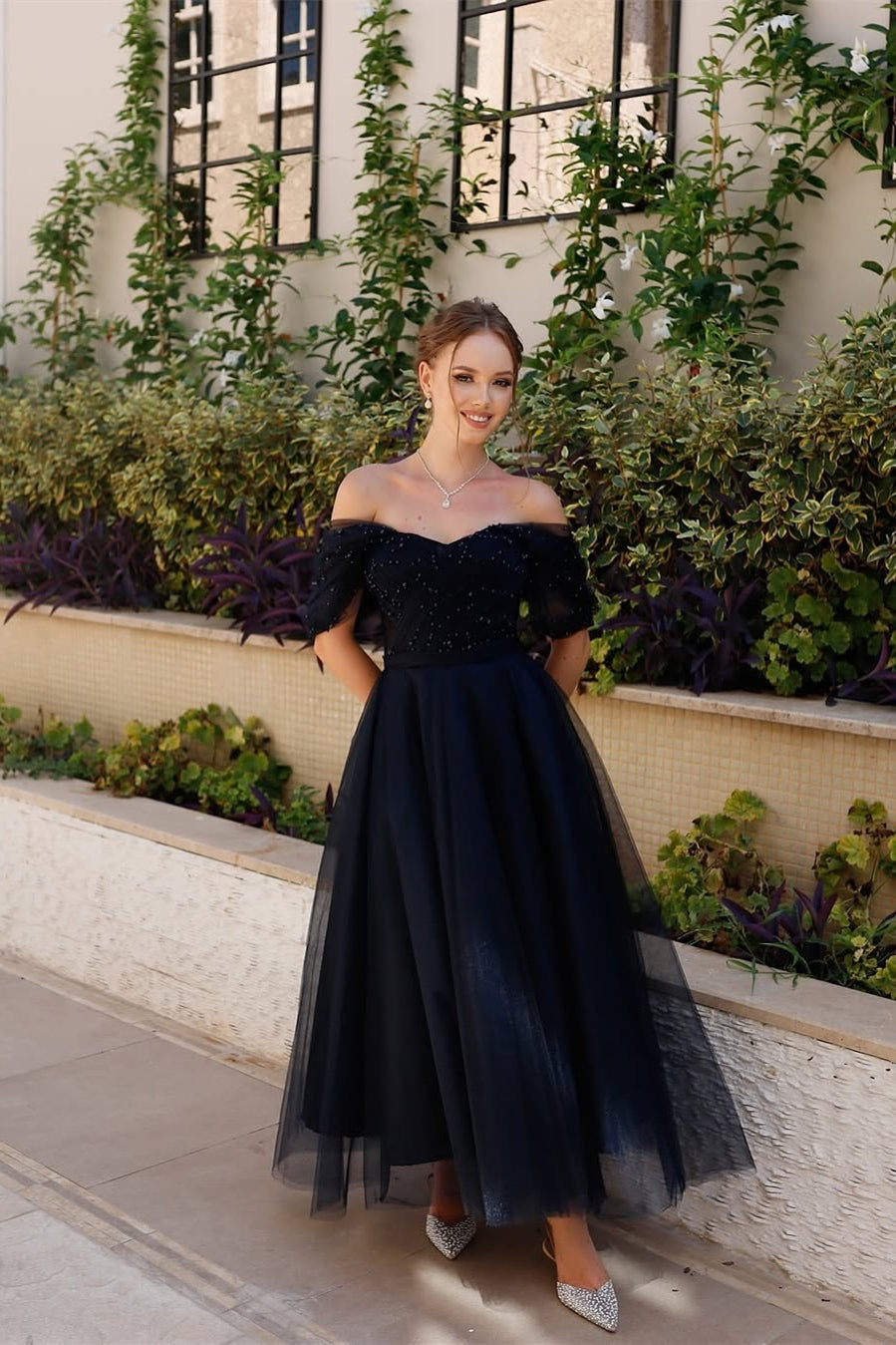 Elevate your evening with this navy blue off-the-shoulder prom dress, crafted from delicate tulle for an ethereal look. The sleeveless A-line silhouette flatters every figure, while subtle bead detailing adds refined sparkle. A discreet zipper ensures a seamless fit, making this gown a sophisticated choice for unforgettable occasions.