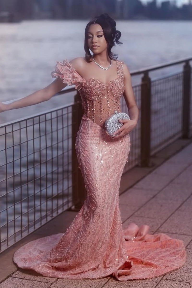 Captivate in timeless elegance with this stunning dusty rose prom gown. The off-the-shoulder sweetheart neckline frames the decolletage with romantic allure, while the mermaid silhouette hugs the body before flowing gracefully to the floor. Intricate bead work adorns the bodice and skirt, catching light with every movement for an enchanting, luminous effect. The column construction creates a sleek, refined line that flatters and elongates. Perfect for prom, formal galas, or any occasion demanding couture-level sophistication and drama.