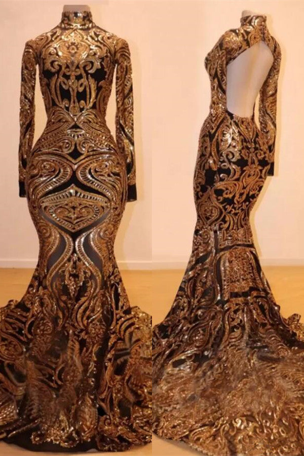 Mermaid Prom Dress Gold Appliques Open Back Long Sleeves