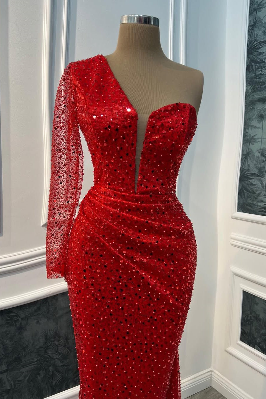 Timeless Red One Shoulder Long Sleeves Sequins Prom Dresses Mermaid Online