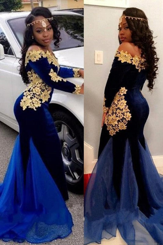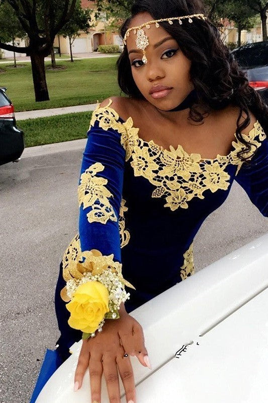 Chic Mermaid Long Sleeves Off-the-Shoulder With Appliques Velvet Prom Dress
