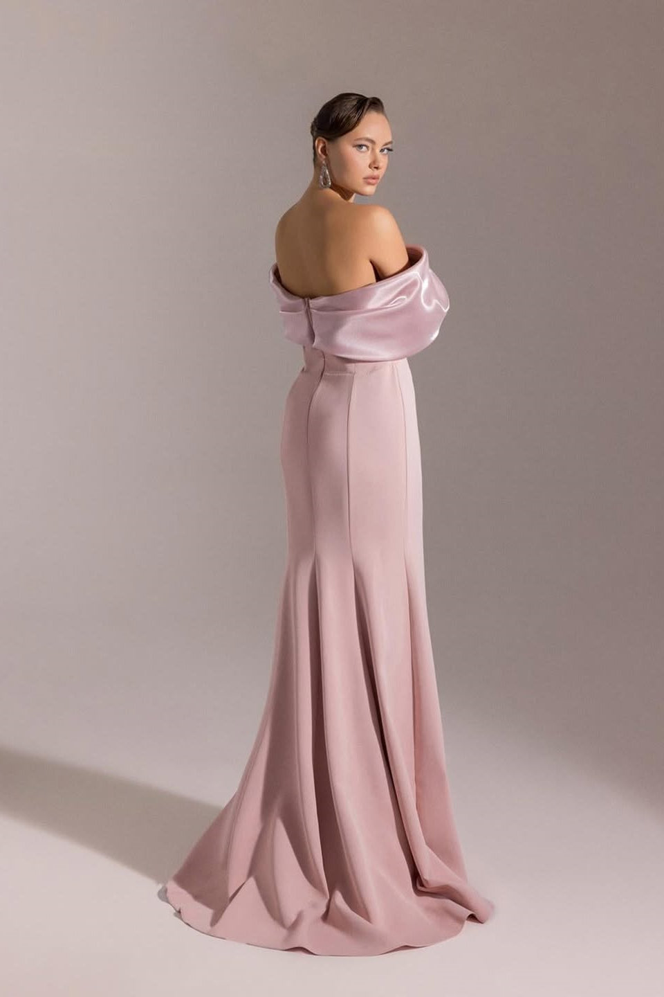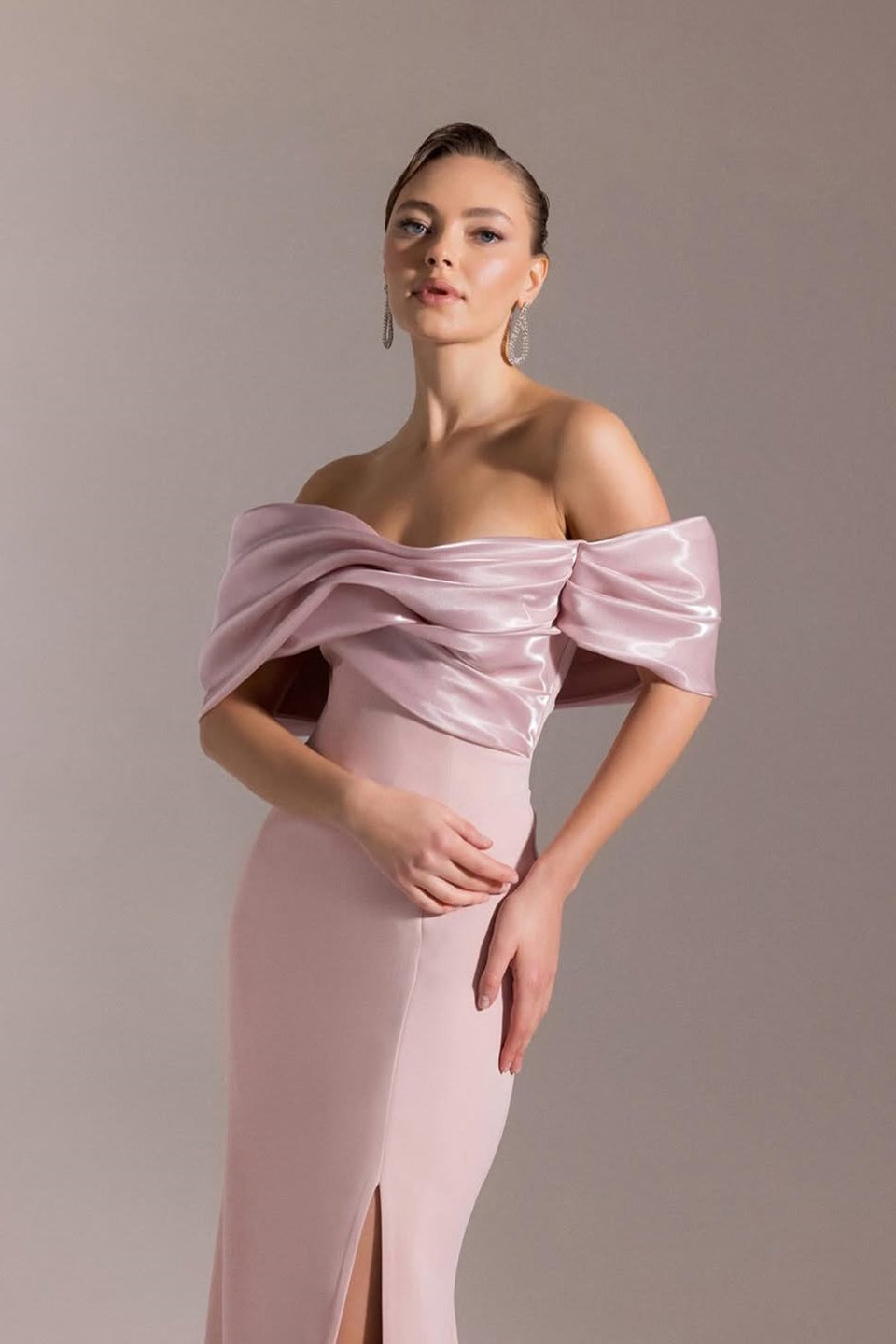 Embrace timeless elegance in this sophisticated dusty pink mermaid gown. The off-the-shoulder neckline creates a graceful, romantic silhouette while the sleek satin fabric drapes beautifully along the body. A high side split adds modern allure and movement, while the fitted column bodice flatters your figure. Finished with a discreet zipper closure for effortless wear. Perfect for prom, galas, or any formal occasion where understated luxury speaks volumes.