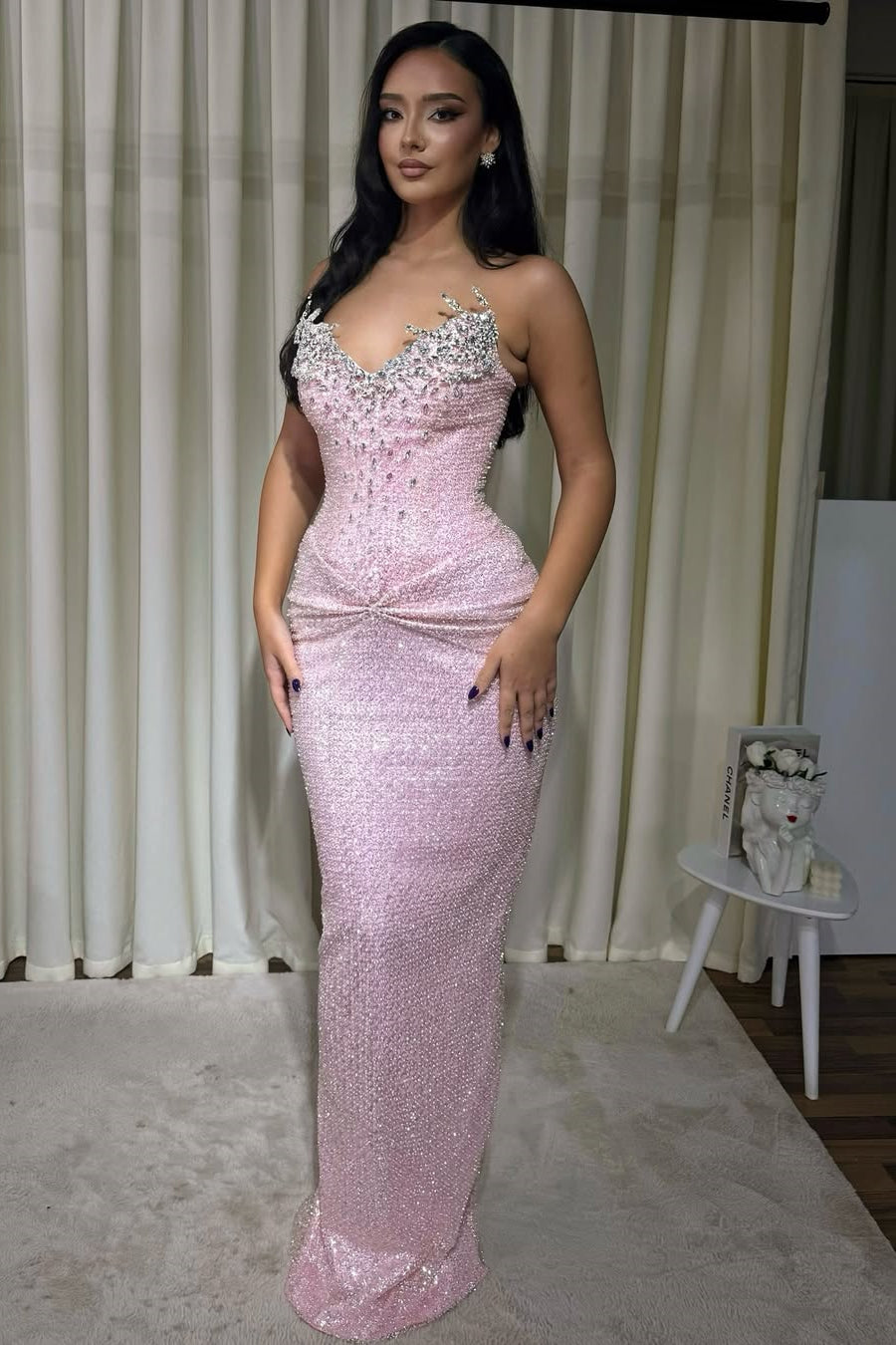Elevate your prom night with this stunning mermaid silhouette gown. The dreamy pink hue creates an enchanting presence, while the strapless V-neckline offers timeless elegance and flattering lines. Delicate gem-adorned pleats cascade down the sheath skirt, adding luxurious dimension and sparkle. Sleeveless and refined, this dress combines romantic sophistication with modern glamour, ensuring you make an unforgettable entrance. Perfect for those seeking a show-stopping look that balances grace with dazzling detail.