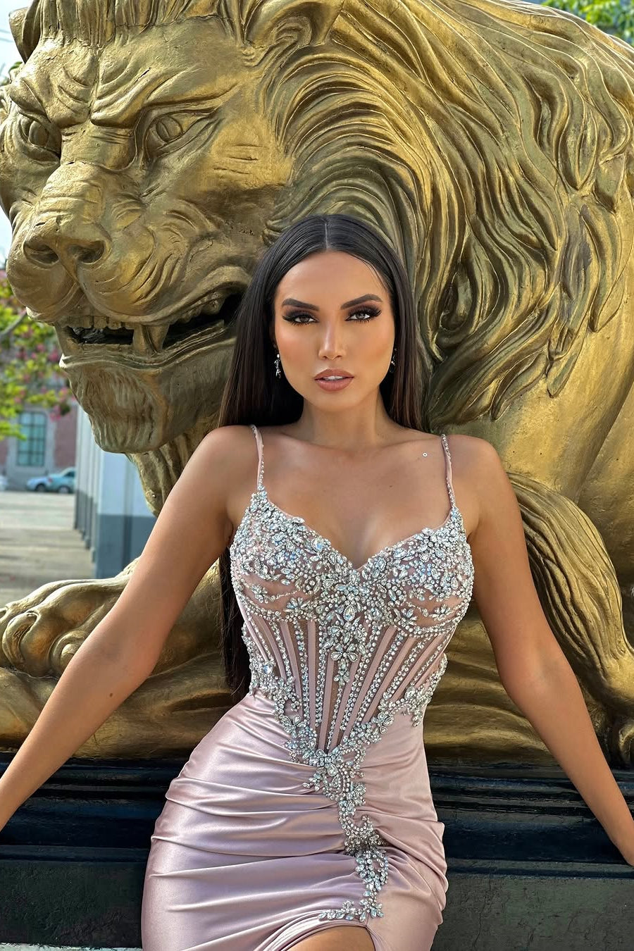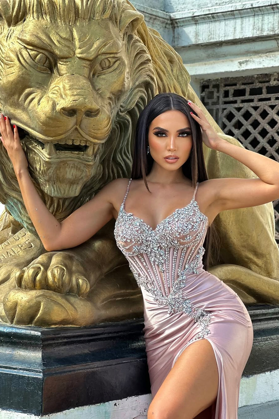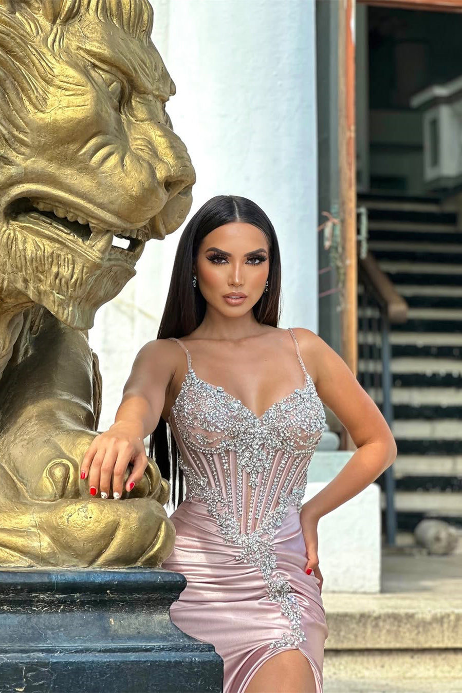 Make a stunning entrance in this sophisticated pink prom dress, designed to captivate. The elegant V-neckline and delicate spaghetti straps frame the shoulders beautifully, while the sleeveless silhouette showcases your arms. Crafted from luxurious satin, the mermaid silhouette hugs your curves before flowing gracefully to the floor. Adorned with shimmering gem embellishments and featuring a daring high split, this dress combines timeless elegance with modern glamour—perfect for an unforgettable evening.