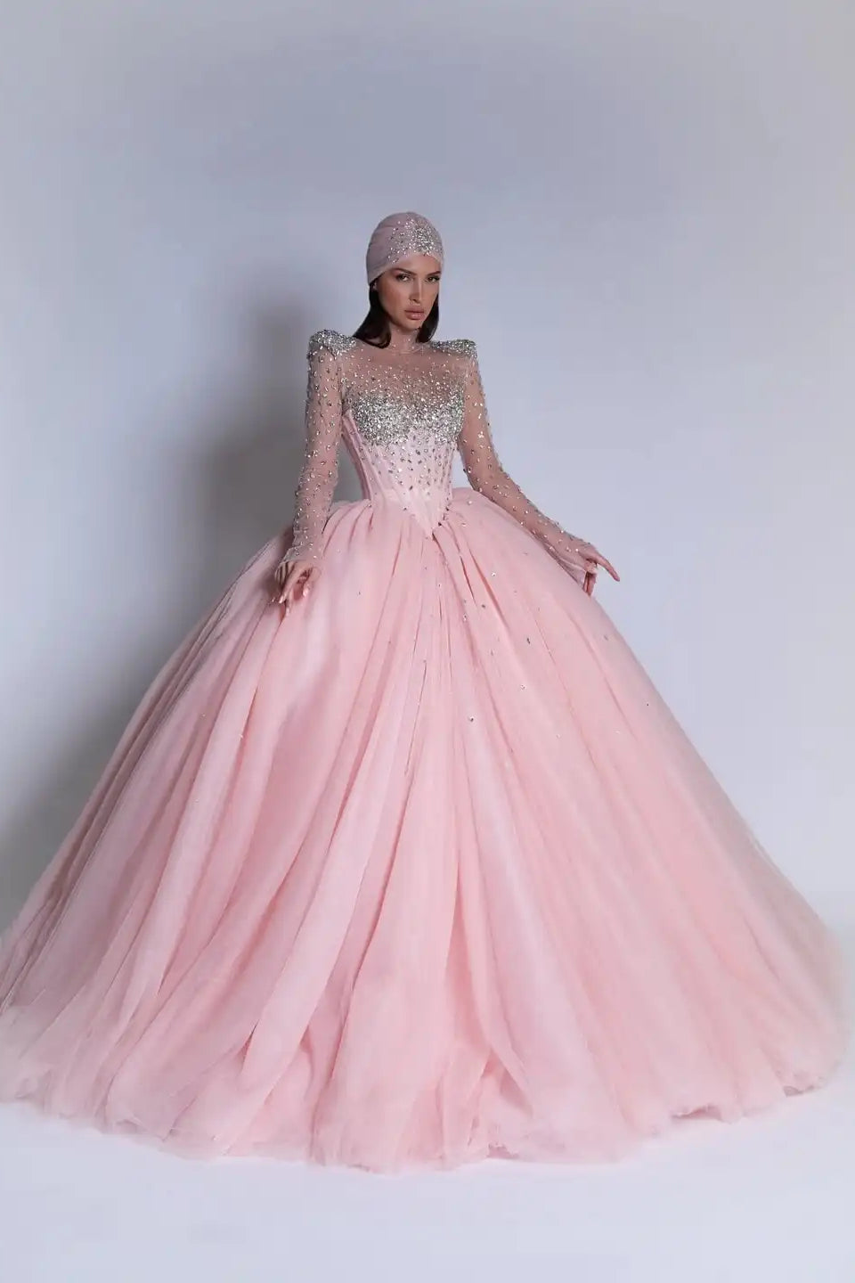 Make a stunning entrance in this luxurious pink ball gown, designed for those who demand elegance and refinement. The high collar and long sleeves create a graceful silhouette, while intricate gem embellishments add captivating sparkle. The dramatic lace-up back detail provides both visual interest and a custom fit, ensuring you feel as magnificent as you look. Perfect for prom, galas, or any formal occasion where you want to command attention with timeless sophistication.