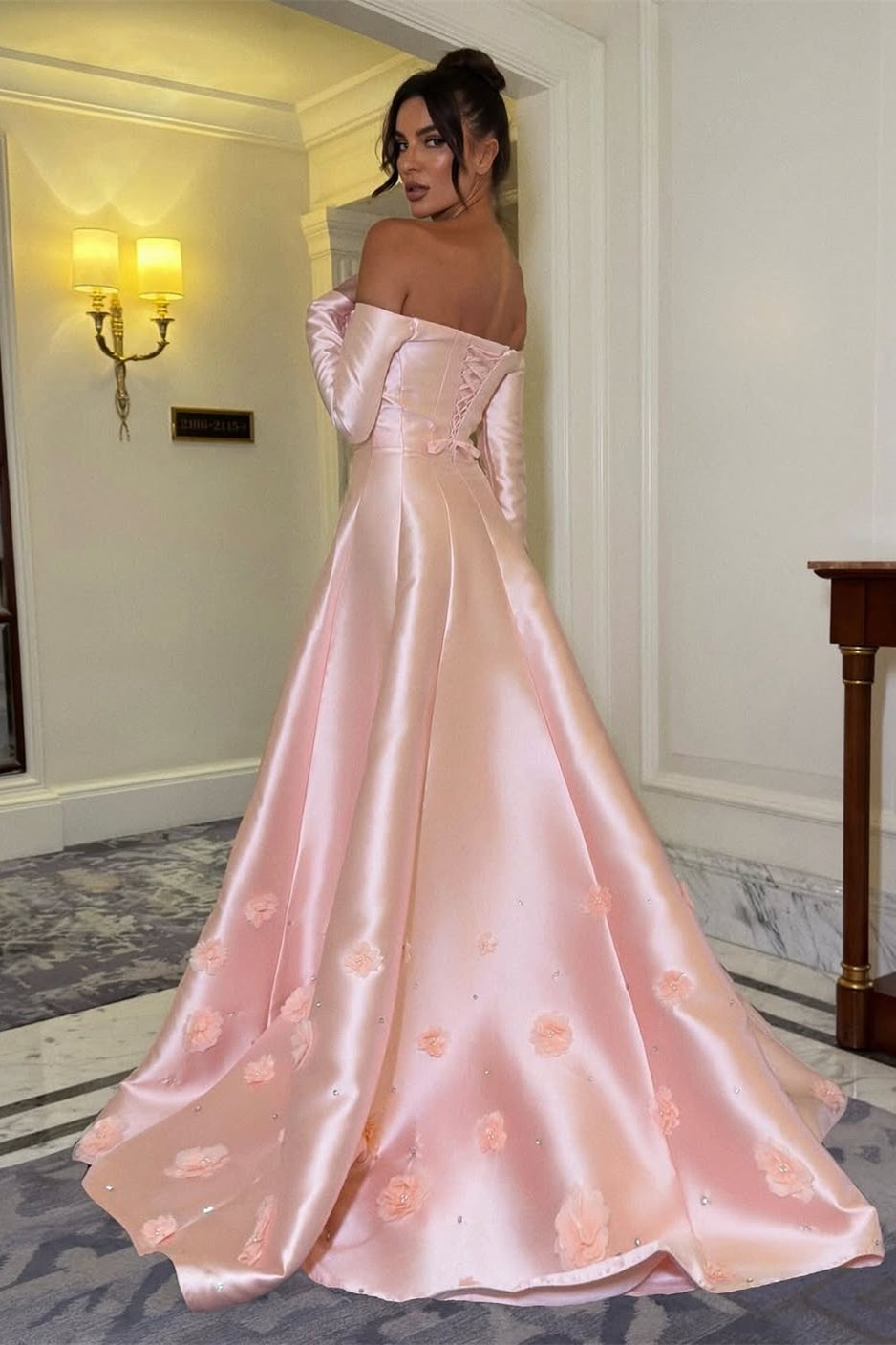 Timeless Pink Off-The-Shoulder Long Sleeves Satin Prom Dresses A-Line Lace-Up Back With Flower