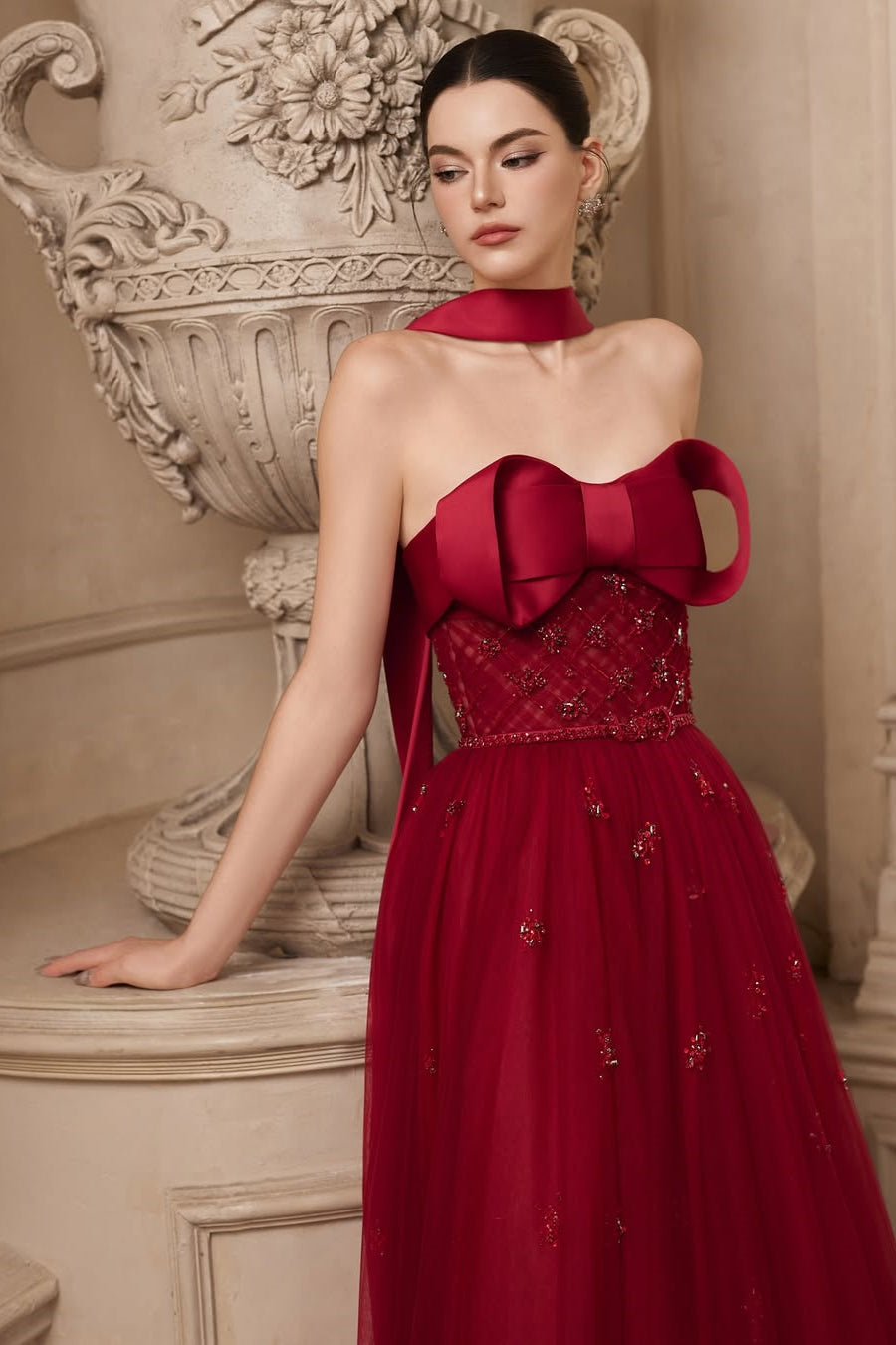 Elevate your evening with this elegant burgundy strapless prom dress, crafted in soft tulle for a graceful A-line silhouette. The sleeveless design highlights your shoulders, while delicate beadings and a charming bow knot accent add refined sparkle and sophistication. Perfect for making a memorable impression at any formal event.