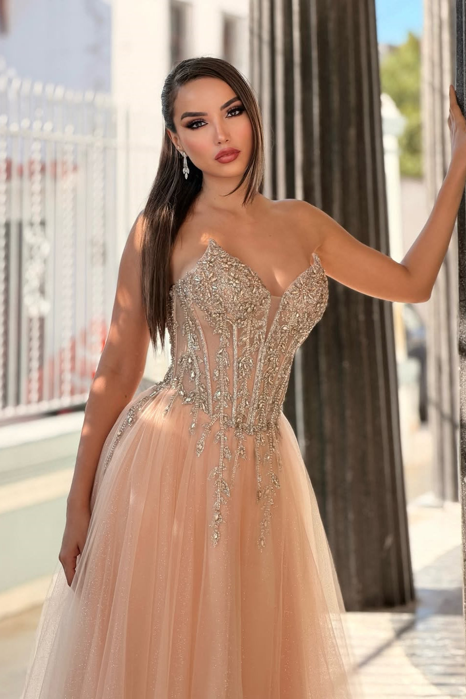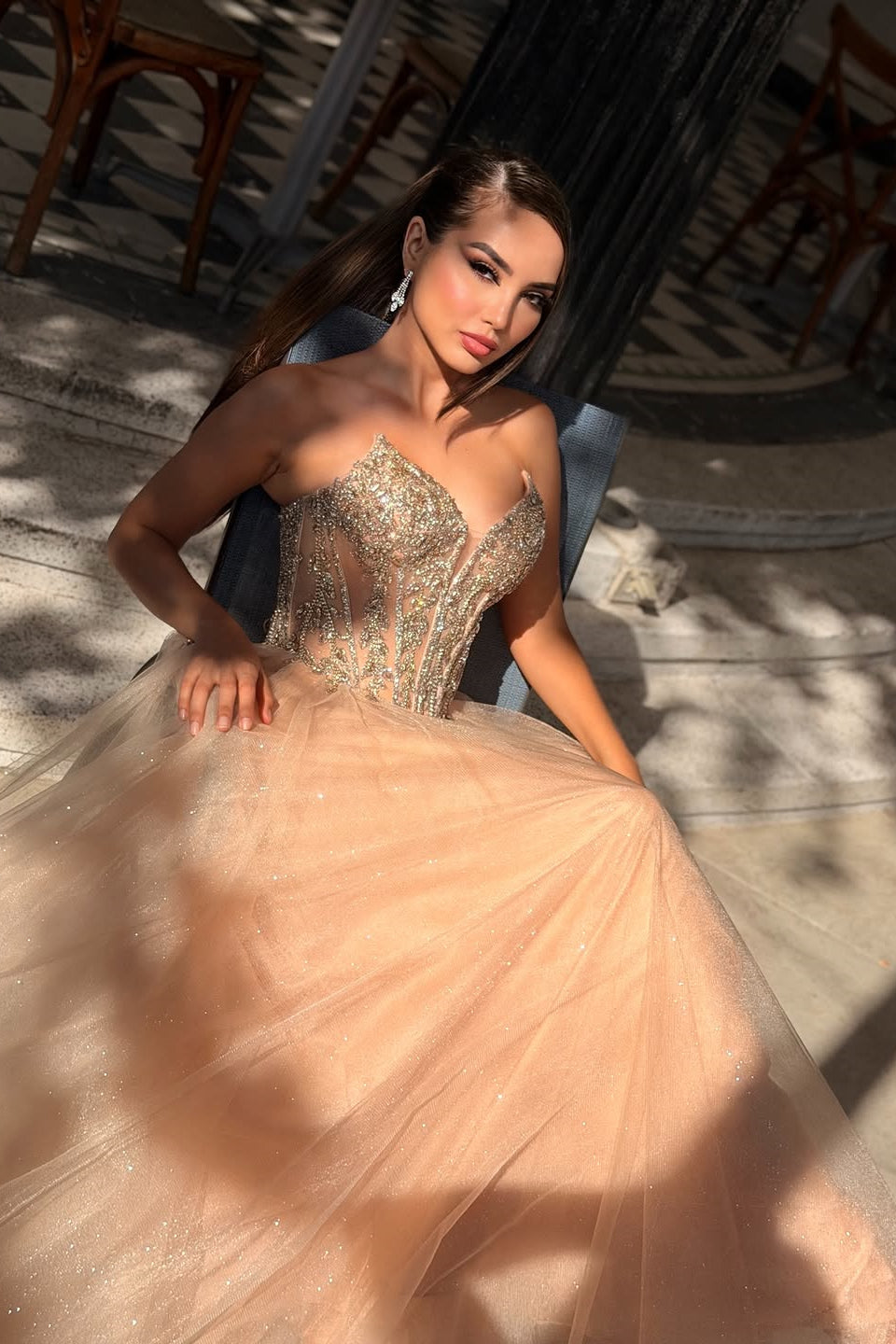 Elevate your prom night with this stunning coral gown that seamlessly blends elegance and allure. The sweetheart V-neckline and strapless design create a flattering silhouette, while luxurious tulle fabric flows gracefully in a classic A-line cut. Delicate gem embellishments add a touch of refined sparkle, catching light with every movement. The floor-length skirt ensures an effortlessly sophisticated presence as you make your grand entrance. Perfect for those seeking a timeless yet contemporary look that commands attention.
