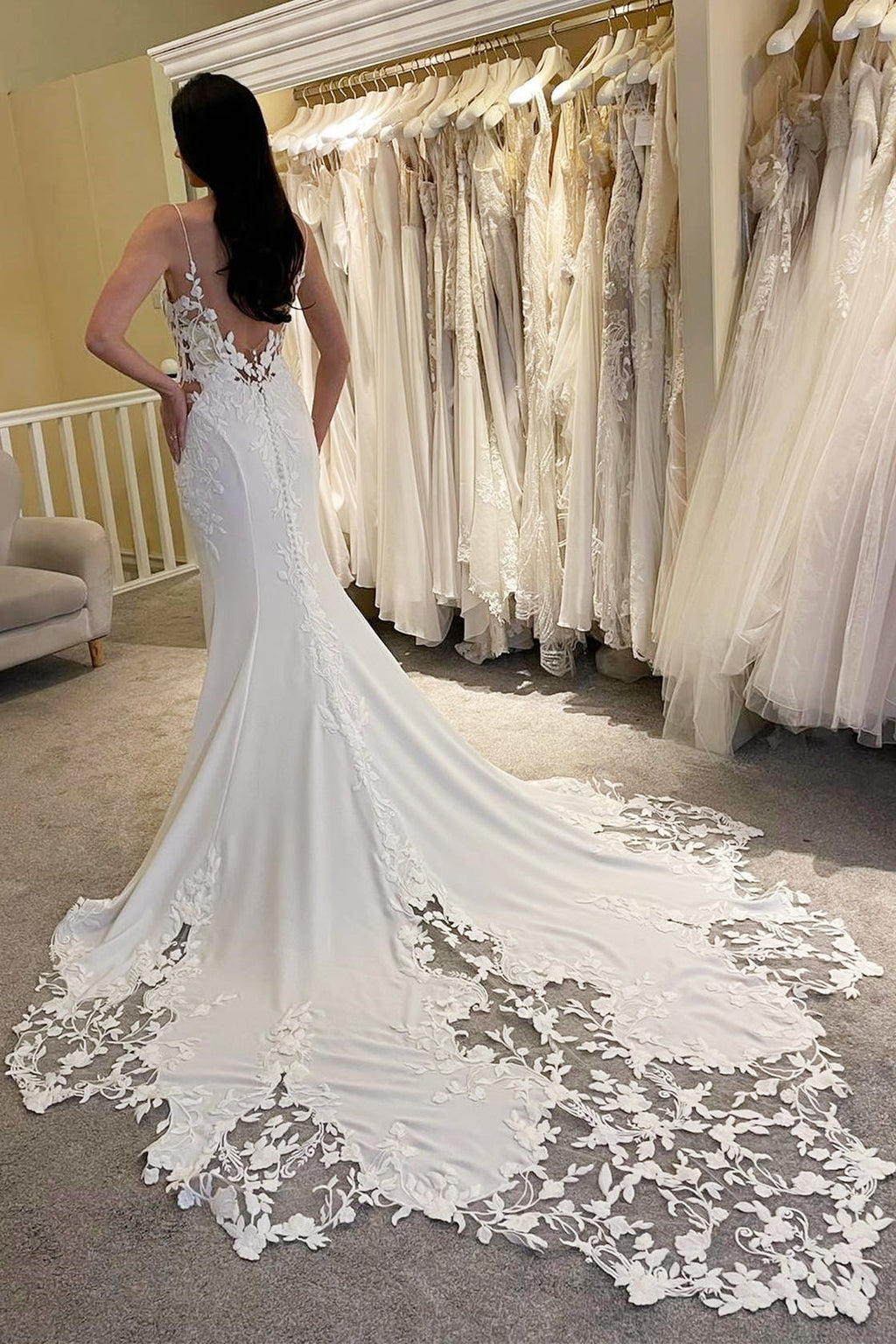This elegant mermaid wedding dress features a flattering V-neckline and delicate satin spaghetti straps that highlight the shoulders. The sleeveless design and open back add a touch of allure, while intricate lace appliques enrich the gown with timeless sophistication. Crafted to embrace your silhouette gracefully, this dress is perfect for a bride seeking refined beauty and subtle glamour on her special day.