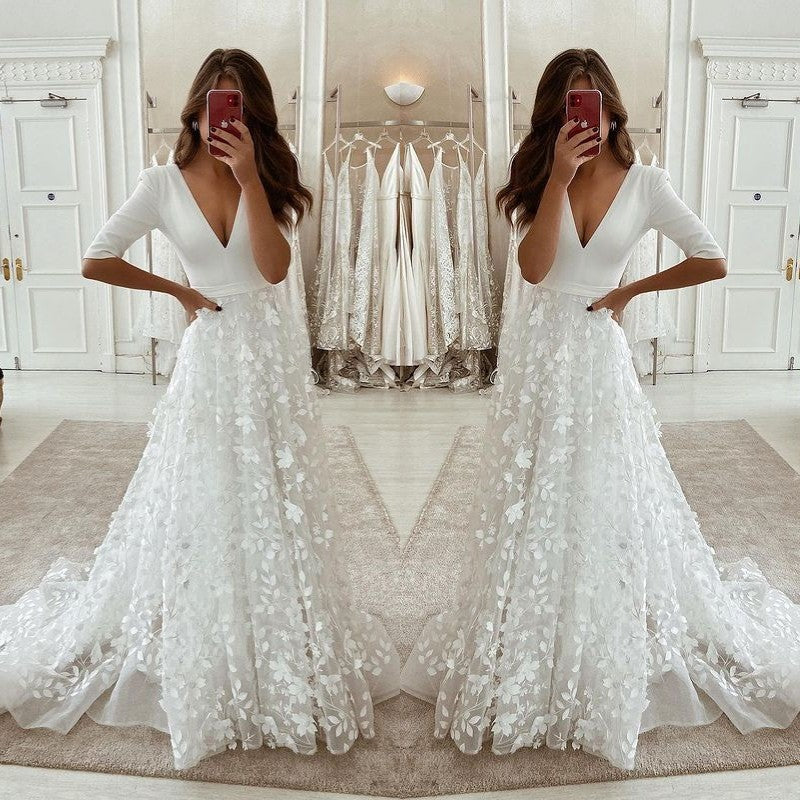 Amazing Appliques Long Wedding Dress On Sale Half Sleeve