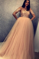 Ball Gown Short Sleeves Scoop With Appliques Tulle Prom Dress